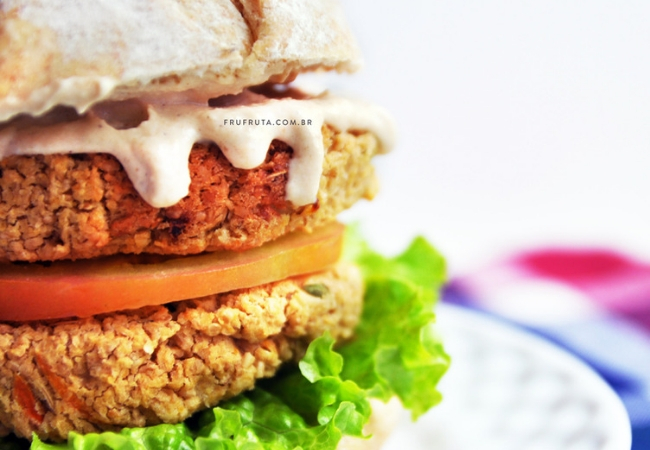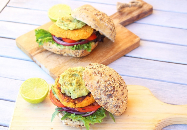 Com a batata-doce também é possível ter um hambúrguer com ótima consistência. Além do mais, o sabor da batata deixa o prato muito mais gostoso. Para temperar, a sugestão é usar açafrão, pimenta, sal, páprica, cominho, coentro, alho e cebola. Essa receita inda leva um creme de abacate por cima.