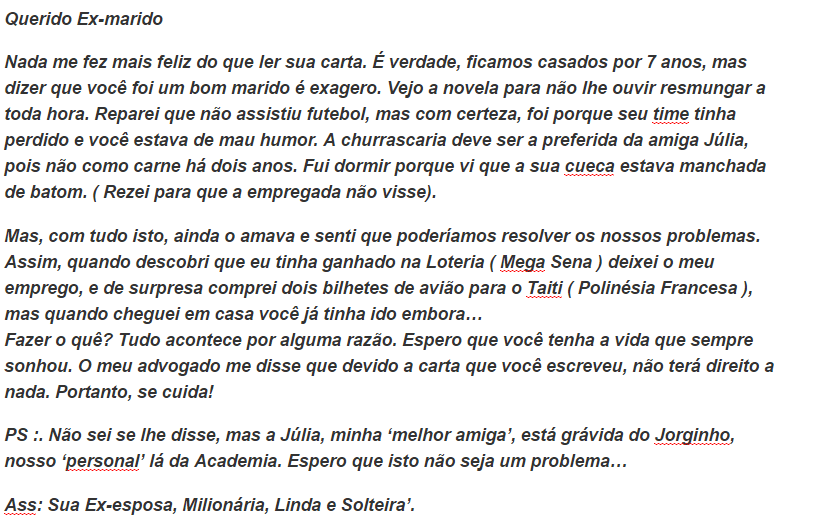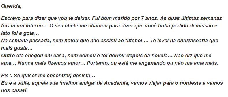 Entre comentários pouco agradáveis, se queixa do rumo levado pela a vida dois, que resultou num casamento monótono. Lamenta que a vida íntima dos dois há muito esteja num impasse, e acusa a mulher de ter perdido todo o interesse físico por ele. Chega a insinuar que talvez ela o esteja traindo, e, despede-se dizendo que está fugindo com uma amiga da esposa. Confira a carta enviada pelo marido:
