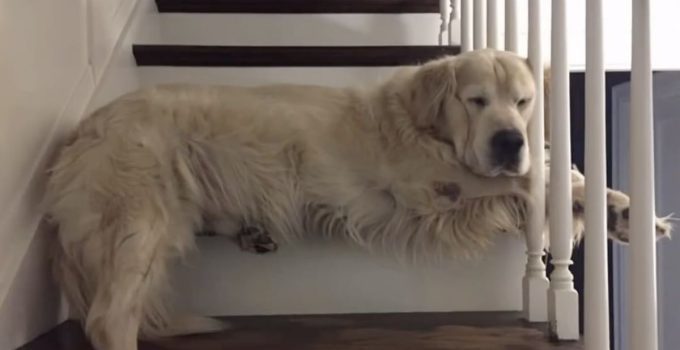 Max, o Golden Retriever, tinha um degrau favorito na escada da casa de Shari Blivin. Esse degrau, no meio da escada, era o lugar perfeito. De lá, Max observava tudo e ficava à altura dos olhos quando alguém da família passava. Ele adorava tanto esse degrau que desgastou a pintura com suas sonecas.