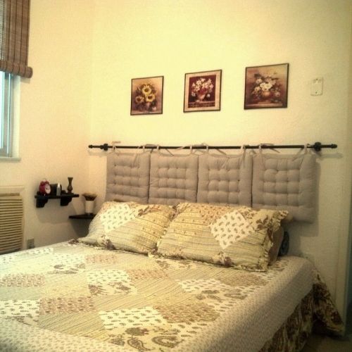 Com umas almofadas de futon, dessas que você coloca no assento das cadeiras e bancos, e um varão de cortina, está feita a sua cabeceira com encosto confortável.