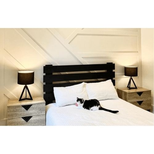 Essa é uma das ideias mais comuns para fazer cabeceira. Esse modelo com pallet pintado de preto ficou sofisticado e é simples de fazer.