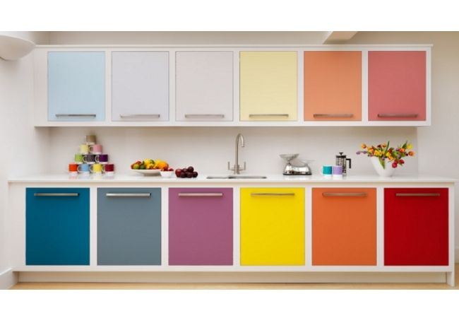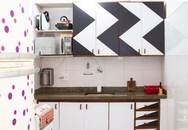 O papel contact é uma opção de baixo custo e que você pode usar para revestir as portas, gavetas e bancadas dos armários da cozinha, da cor que desejar ou mesmo colorido, como na foto.