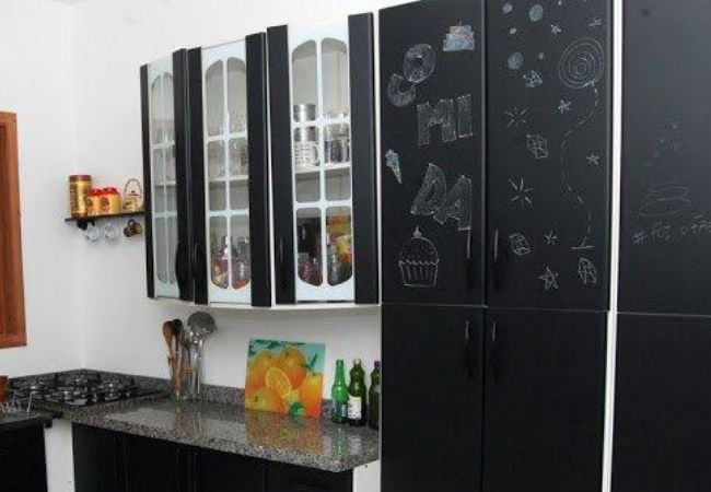 Se quiser deixar a sua cozinha mais criativa e promover uma integração entre as pessoas da casa, ou com os visitantes, a tinta lousa é uma sugestão que está em alta. Depois de seca você usa giz para fazer desenhos e deixar recados.