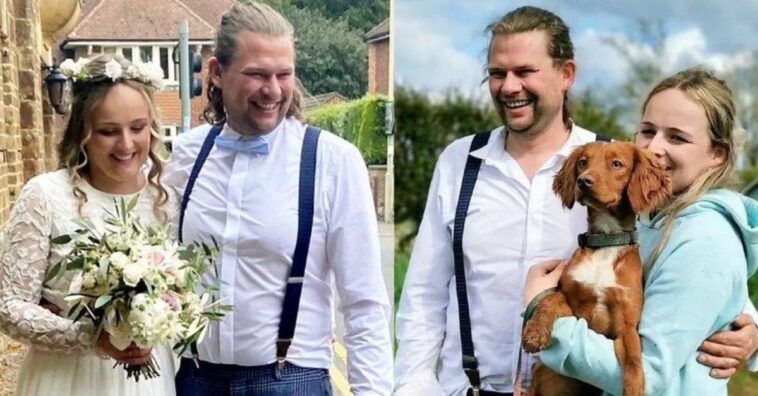 Daniel e Rachel Munday deixaram o seu cãozinho Crash com uma cuidadora no dia do seu casamento, em Cottesmore, uma vila no norte do condado de Rutland, em East Midlands, Inglaterra.