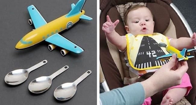 Quando éramos crianças tínhamos que imaginar que a colher era um aviãozinho, mesmo não tendo certeza de como era um aviãozinho. Agora existe um suporte de avião para a colher, fazendo a hora do almoço ser mais fácil e divertida.