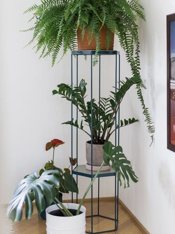 Essa é uma das ideias mais práticas para ter um jardim na sala sem gastar muito. Uma floreira de ferro alta e preta deixa o ambiente bem moderno e pode receber várias espécies de plantas de porte pequeno.