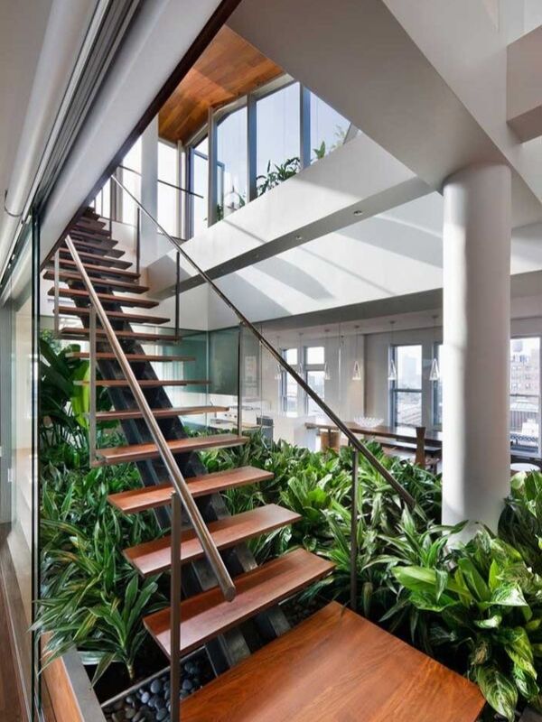 Que tal preencher todo o espaço em volta da escada com folhagens? É uma ideia linda e muito agradável, agregando muito valor à decoração da sala.