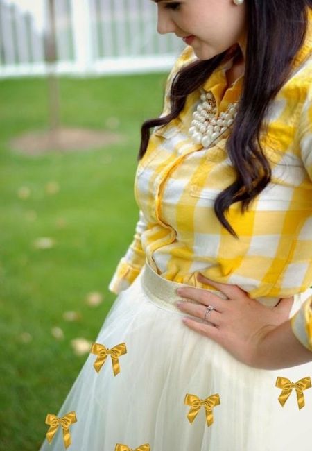 Mais uma vez a ideia da saia de tule com laços entra em cena, mas dessa vez com um look todo em amarelo e branco.