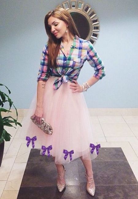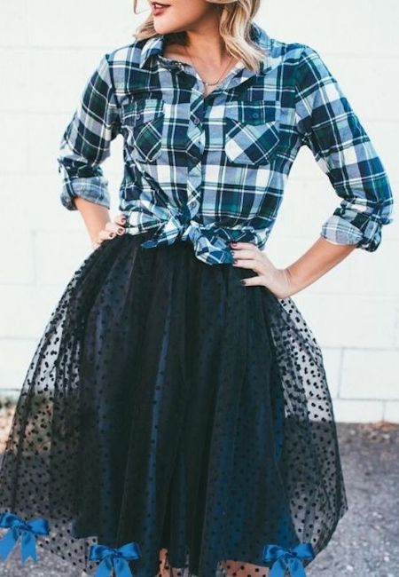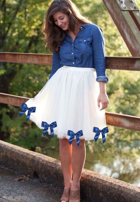 Tem uma camisa jeans azul de botão no seu armário? Então metade do look já está montado, e nem precisa aplicar remendos nela. Combine com uma saia de tule com laços na barra e vai ficar maravilhoso.