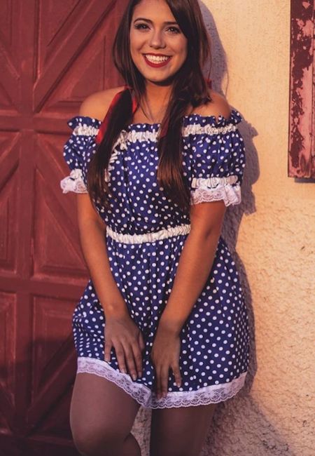 Um simples vestido curto azul com bolinhas brancas já vai deixar o seu visual bem festa junina. Coloque uma meia e uma sandália e já vai estar pronta para a festança.