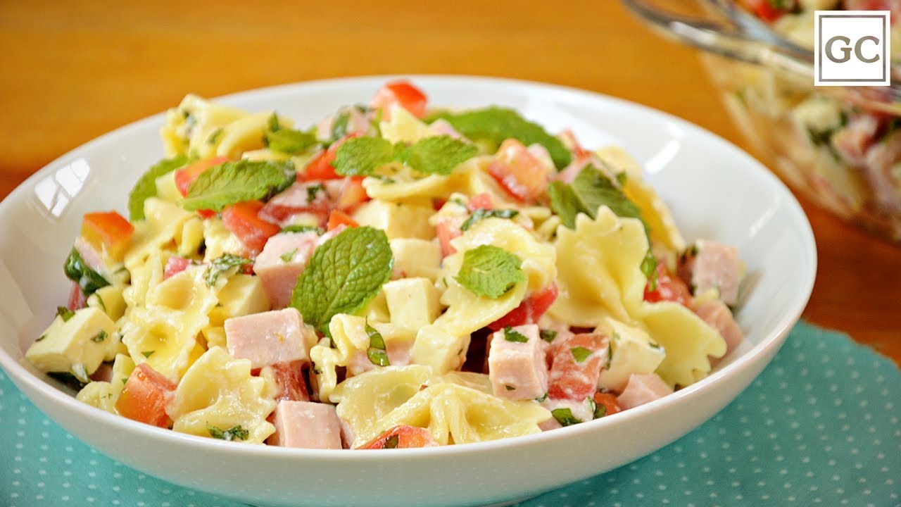 Essa parece uma macarronese, mas no lugar da maionese é usado iogurte natural desnatado para uma versão mais saudável. Também leva queijo minas, peito de peru, tomate, hortelã, azeite e sal. Mais leve e igualmente saborosa. Aprenda a fazer: