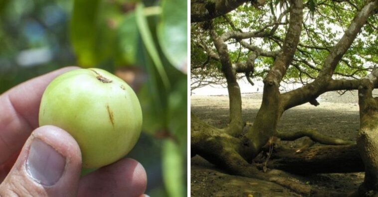 Essa árvore, de nome botânico Hippomane mancinella, é grande, podendo atingir até 15 metros de altura. Ela faz uma boa sombra e, ao olhar, parece inofensiva. Claro, olhar você pode. O que não é recomendado é entrar em contato com qualquer parte dela, desde a casca até seus frutos.