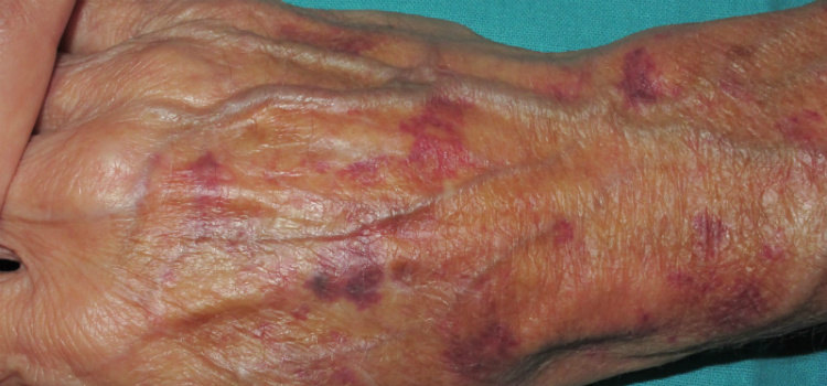 De acordo com o dermatologista Emmanuel Franca, a púrpura senil é uma mancha arroxeada que aparece principalmente nas mãos e braços de pessoas idosas. Ela se dá principalmente por causa “da fragilidade dos vasos da pele causada pela diminuição do suporte conjuntivo ao redor dos vasos, consequente atrofia da pele e perda do tecido gordurosos subcutâneo que acontecem com a idade”.