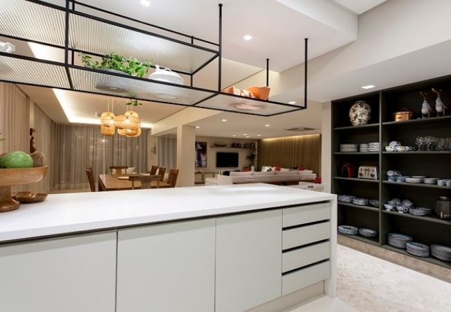 Os ambientes sociais foram integrados, deixando cozinha, sala de estar e de jantar mais abertas e fluidas para que as pessoas que estiverem em qualquer um desses ambientes possam socializar.