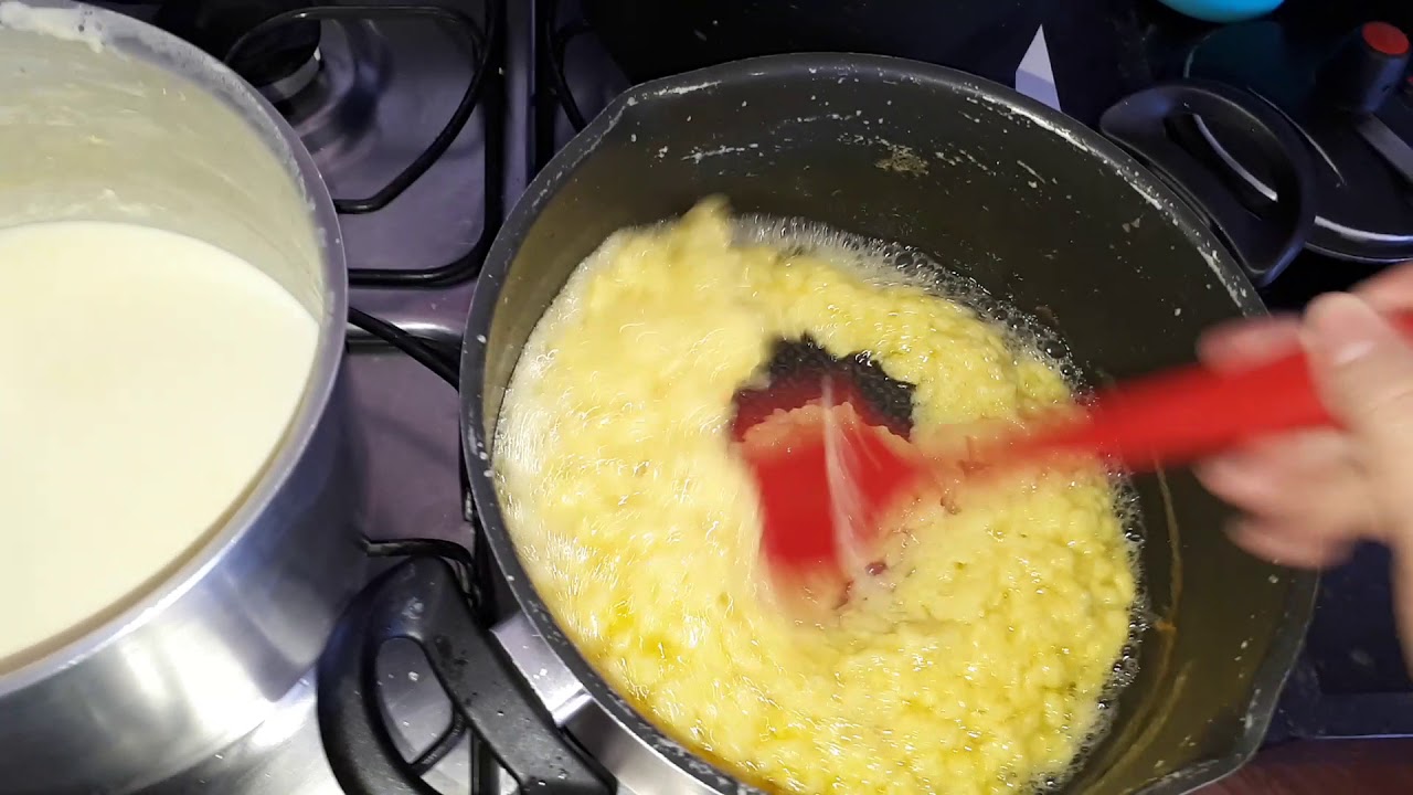 Então, você vai ferver bastante o seu leite e vai deixar ele descansar e esfriar. Quando esfriar, ele vai formar uma camada de gordura por cima, que é chamada de nata.
