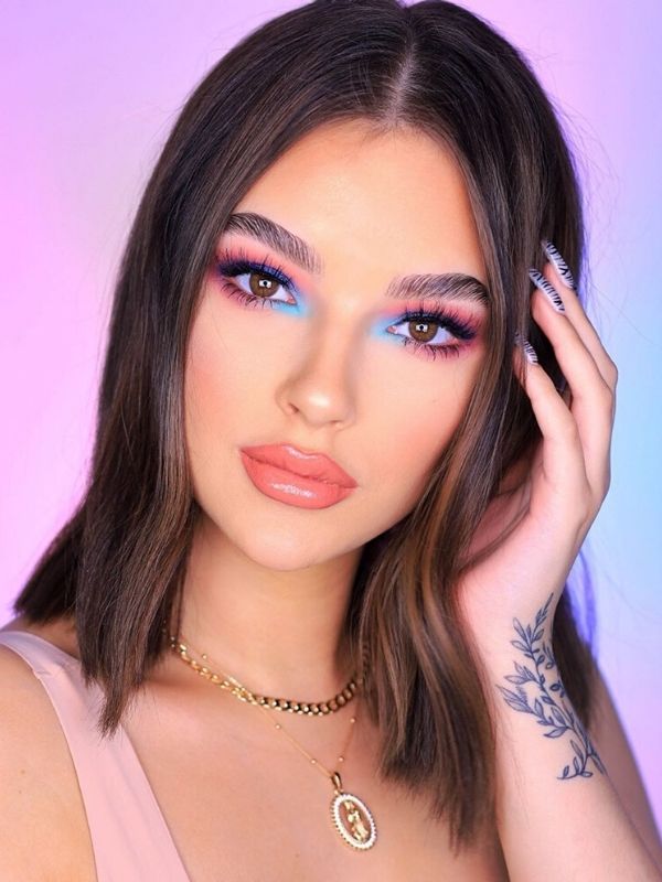 modelo maquiagem colorida azul e lilás