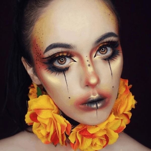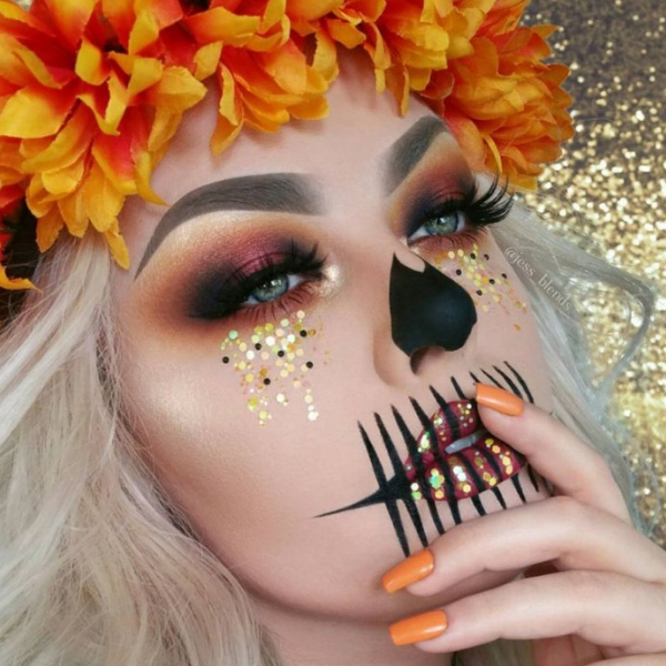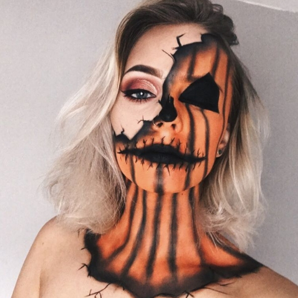Ao invés de apenas colocar uma máscara de abóbora, que tal se dedicar na maquiagem e fazer uma opção linda como essa? Vai ser um arraso. Depois é só caprichar em um visual em laranja e preto.