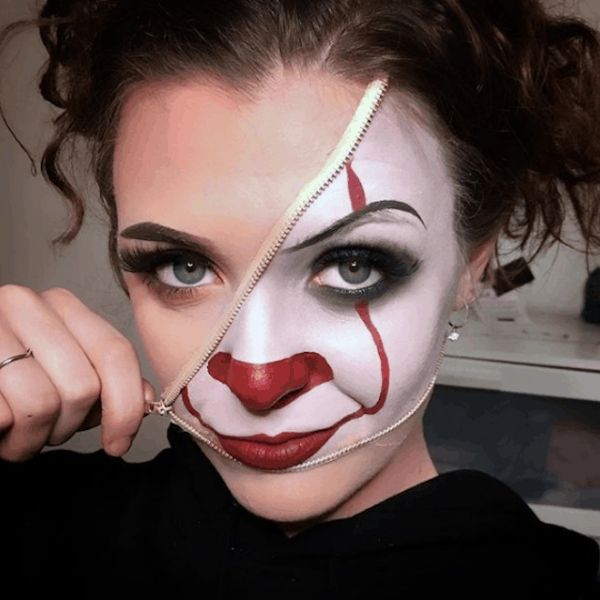 Em vez de pintar o rosto todo com a make clássica do IT, essa ideia de pintar meio rosto como se estivesse abrindo a pele com a maquiagem por baixo é sensacional.