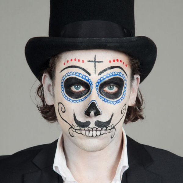 Outra forma de ir para a festa como caveira é fazendo uma pintura ao estilo caveira mexicana. Essa é mais divertida, com flores e vários detalhezinhos contornando o rosto inteiro. Fica bem fácil montar o look depois.
