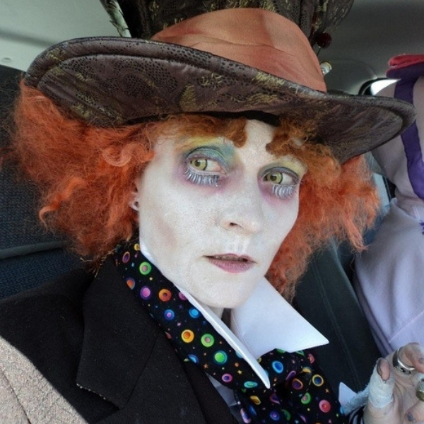 Se estiver disposto a caprichar na fantasia completa, aqui está outra ideia também do filme “Alice no País das Maravilhas”. O Chapeleiro Maluco tem uma make mais elaborada, especialmente nos olhos, com cílios postiços.