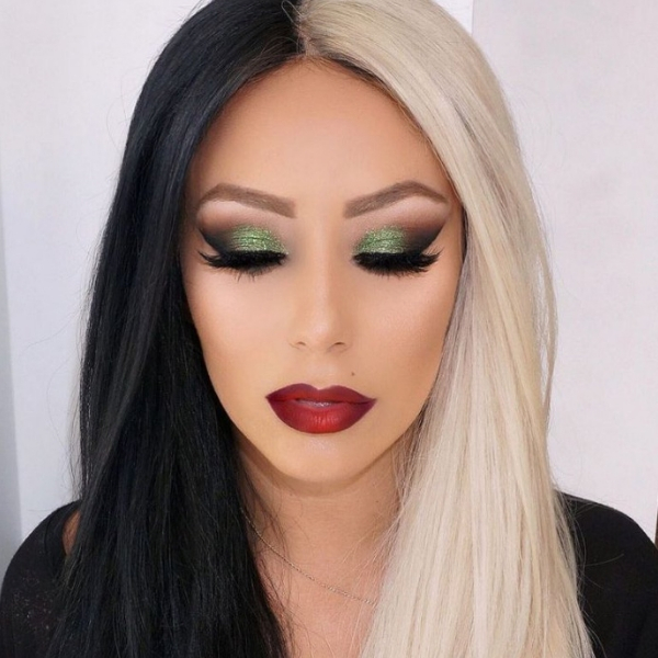 A Cruella, personagem do filme “101 Dálmatas”, também é muito simples de fazer, pois você pode usar a criatividade. O que mais chama atenção nela é o cabelo, metade preto e metade branco. Então, a única regra da make é que seja bem marcante.
