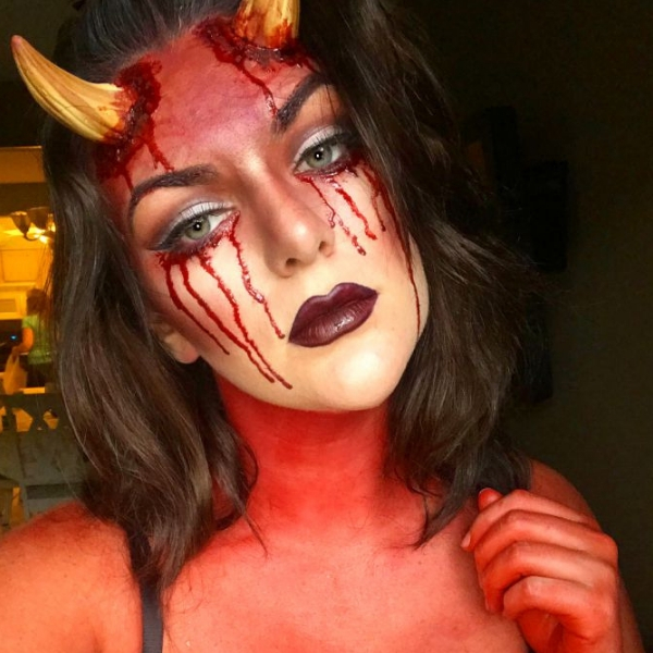 Se decidir ir à festa com fantasia de diabo, que é um dos clássicos, a maquiagem de Halloween pode ser nesse estilo. Se não tiver como colocar o chifrinhos, use-os em forma de tiara na cabeça.