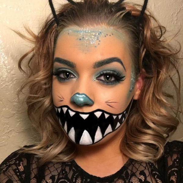 Esse é outro modelo que combina tanto para as meninas quanto para os meninos. Assim como na make do gato sorridente, o efeito principal está na boca, então vai ter ficar de sorriso fechado para mostrar o look completo.