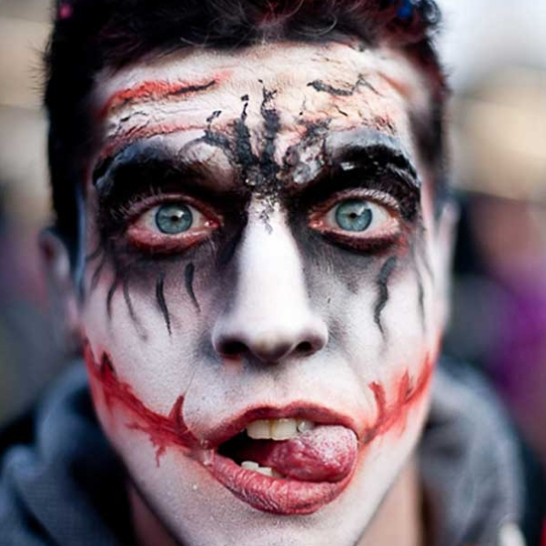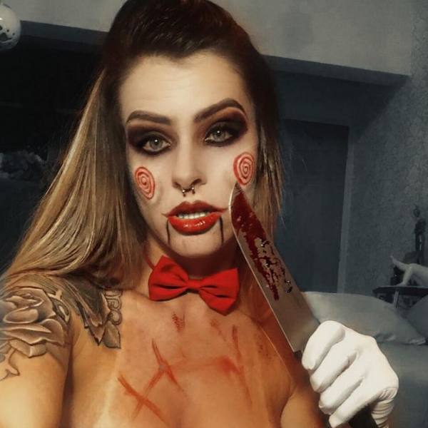 O personagem do filme “Jogos Mortais” é outra temática perfeita para usar como fantasia de Halloween. É bem simples de fazer, e o grande toque são as bochechas em caracol. Também é muito mais legal do que apenas colocar uma máscara.