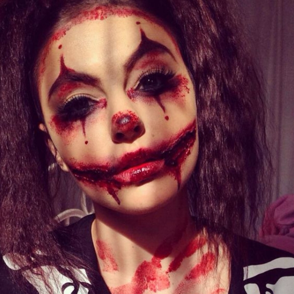 Essa ideia de maquiagem de Halloween com tema de palhaço macabro é simplesmente perfeita. Sai do convencional rosto colorido e usa esses efeitos especiais de cortes e sangue. Se tiver o material necessário para fazer, vai arrasar na festa.
