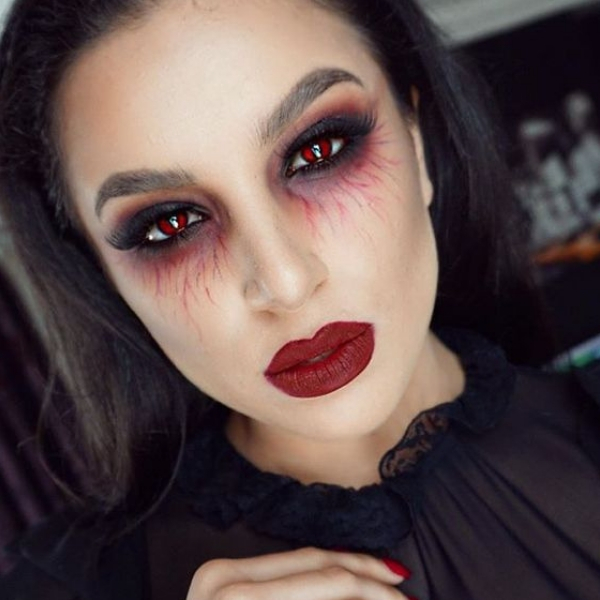Mesmo que não quiser colocar a dentadura com os caninos enormes, dá para fazer uma linda maquiagem de vampira, caprichando no batom e nos olhos. Esse efeito com veias aparecendo é bem legal. Para ficar perfeito, uma lente de contato colorida é o toque final.