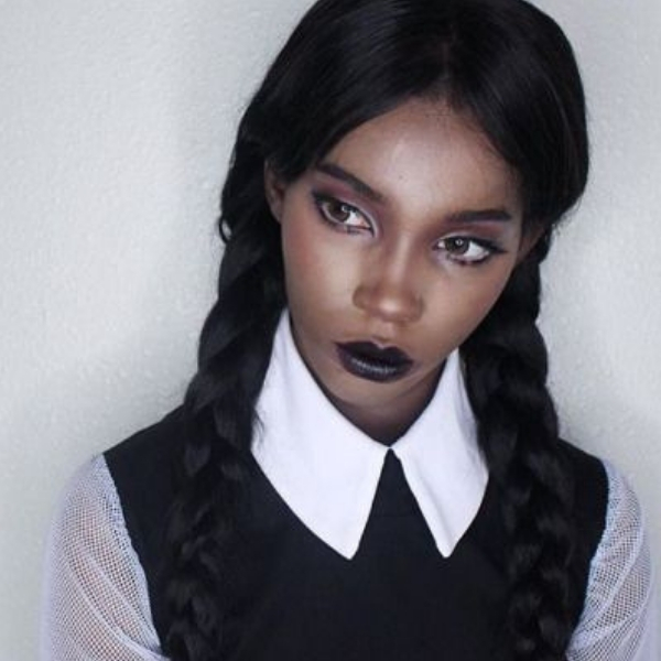 A filha da Família Addams também é um clássico para o Halloween. A make dela é bem simples, então é na fantasia que precisa caprichar. E claro, não esquecer das trancinhas. É a personagem ideal para quem consegue segurar o riso a noite toda!
