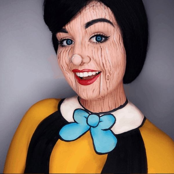 Em um estilo semelhante à anterior, essa opção foi feita para simular a madeira no rosto e realmente deixar a pessoa parecendo um boneco como o Pinóquio.