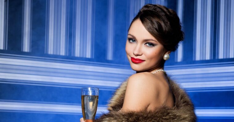 Pele bem clara, cabelo bem escuro, batom bem vermelho e olhos bem marcados. Esse visual geral da face está bastante intenso, portanto, o equilíbrio está na escolha de um vestido de cor mais suave, que pode ter um brilho leve, já que a make é mais fosca. Essa intensidade e os olhos escuros são mais condizentes com eventos noturnos.