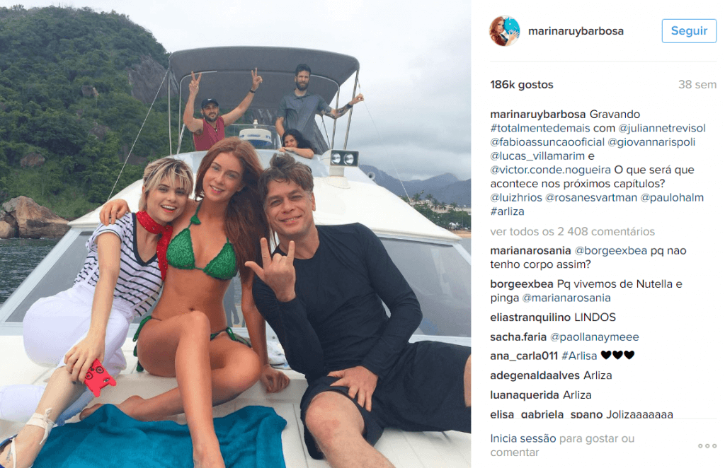 Marina Ruy Barbosa causou furor, quando publicou uma fotografia no Instagram em que aparece de biquíni ao lado de Fábio Assunção e Julianne Trevisol, nas gravações de ‘Totalmente Demais’, novela das sete da Globo.