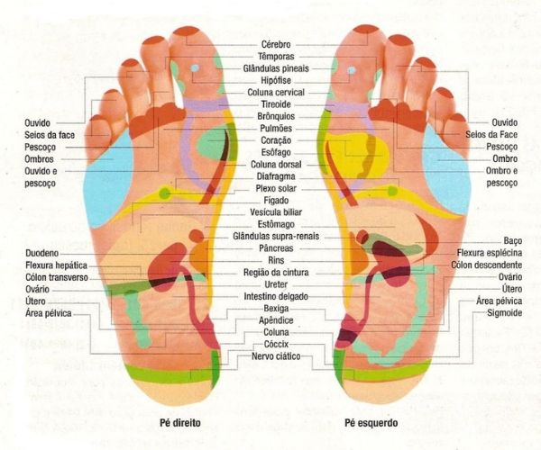 Antes de aplicar a massagem em qualquer ponto do pé é bom começar sabendo se a pessoa que vai ser massageada sente alguma dor específica. Assim, se por acaso tocar em uma parte mais sensível, já sabe que precisa ter cuidado. Para isso, veja na imagem abaixo como cada órgão do corpo está localizado nas plantas dos pés: