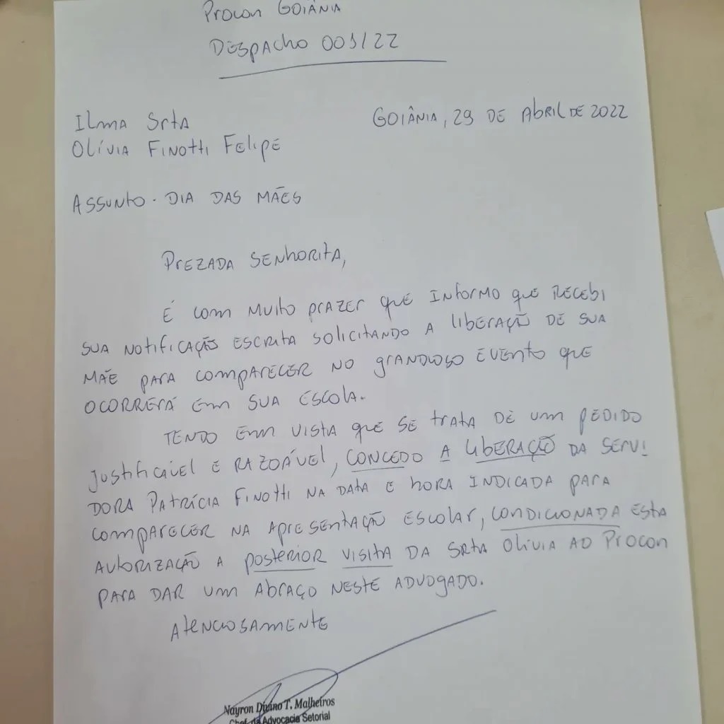“Na quinta-feira (28/4), eu brinquei com ela que só autorizaria se fizesse um pedido formal. Eu falei ontem e hoje ela já mandou essa cartinha toda fofa. Tive que parar um pouquinho, mesmo com a correria do dia, para responder à altura”.