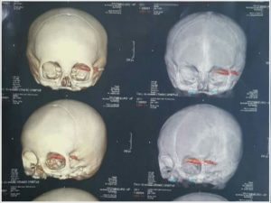 Esta é a imagem do exame realizado na menina, de pouco mesmo de 2 anos, que teve o olho esquerdo furado por uma caneta: