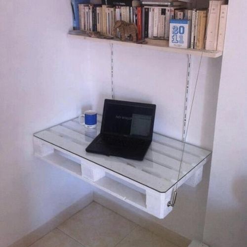 12. Uma mesinha feita de pallet com tampo de vidro e presa na parede com cabo de aço