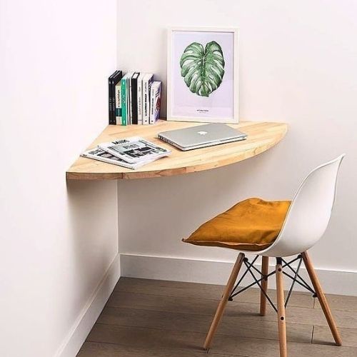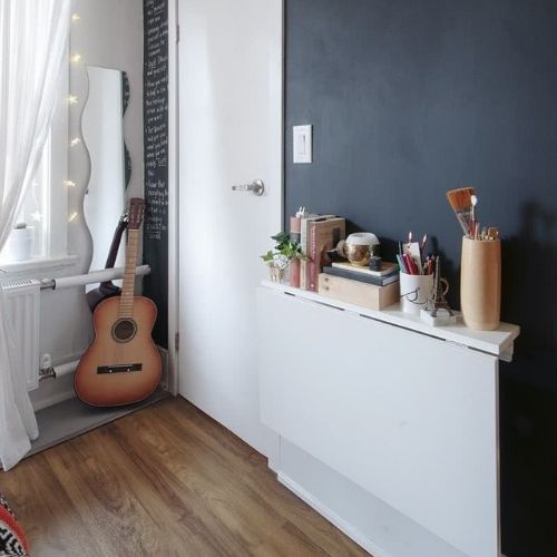 19. Uma mesa de parede acoplada em uma estante, cheia de funcionalidade