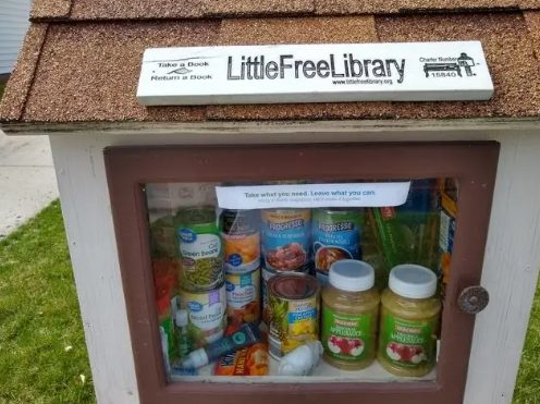 6. Onde antes havia uma pequena livraria grátis, essa pessoa colocou alimentos para quem estiver precisando