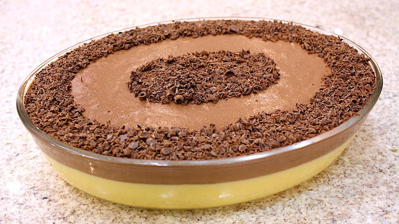 - Montagem: em um refratário grande ou em vários individuais, coloque a metade do mousse, depois o creme de chocolate e cubra com o restante do mousse. Decore com a calda e sementes de maracujá.