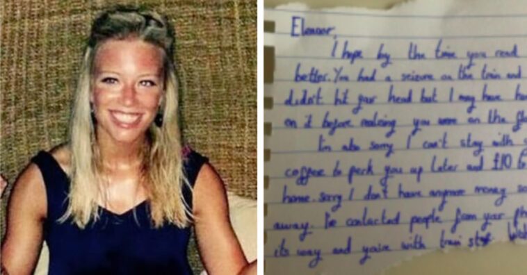 “Olá Leonor. Espero que quando você ler isso você esteja se sentindo melhor. Você teve uma convulsão no trem e eu te segurei. Você não bateu com a cabeça, mas posso ter machucado sua perna enquanto caminhava sobre ela antes de perceber que você estava no chão tendo um ataque! Desculpe! Também sinto muito por não poder ficar com você agora, mas aqui está um café para animá-la mais tarde e £ 10 para garantir que você pegue um táxi para casa. Desculpe, não tenho mais dinheiro, então espero que você não more longe. Entrei em contato com as pessoas do seu telefone e a ajuda médica está a caminho e você está com a equipe do trem. Desejo-lhe tudo de bom e uma rápida recuperação. Amor, Tom.”