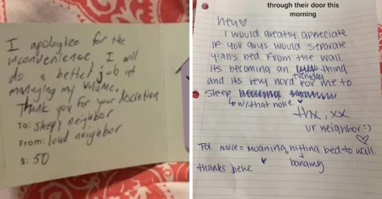 “Ei, eu agradeceria muito se vocês separassem [sua] cama da parede. Está se tornando uma coisa cotidiana e é muito difícil dormir com aquele barulho… Obrigada, sua vizinha”.