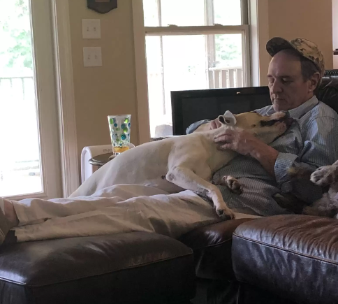 Quando Catey Hall visita seu pai, não é incomum encontrá-lo cochilando no sofá. Mas, o pai de Hall nunca dorme sozinho – cachorros da vizinhança se juntam a ele para fazer uma grande pilha confortável.