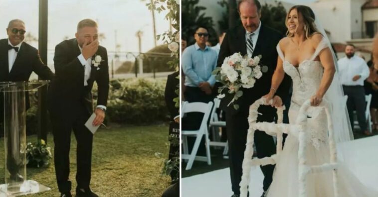 Para ir caminhando até o altar, Chelsie contou com a ajuda de um andador, e precisou se preparar durante algum tempo para fortalecer seus músculos e treinar sua postura.