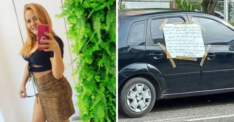 “Alessandro, depois de 13 anos, nós vivendo juntos e você sumir toda semana e vir dormir com essa moça. A gente trabalha juntos e quando você volta pra casa quer transar? Ela não te satisfaz no sexo? Na segunda-feira, volte em casa pra pegar suas coisas porque eu não te quero mais. Crie vergonha na sua cara e venha morar com a moça. Respeite ela. Ass: Naná”, diz o recado colado na janela do carro.