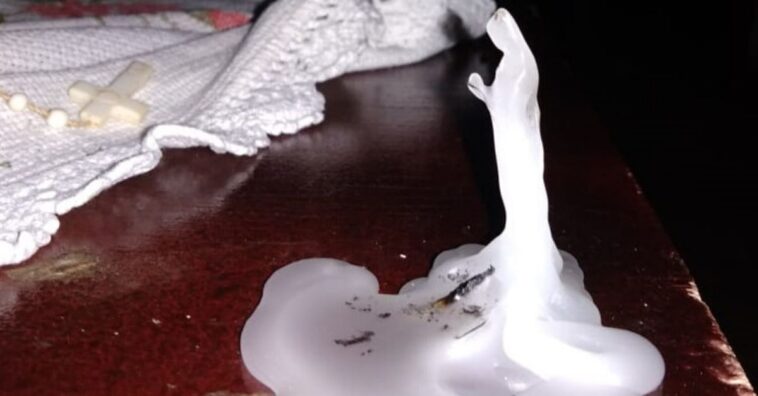 Em dado momento da oração, eles perceberam que havia acontecido uma manifestação física de sua fé; um milagre. A imagem de Nossa Senhora havia se formado na cera de uma das velas que estava queimando em seu nome.