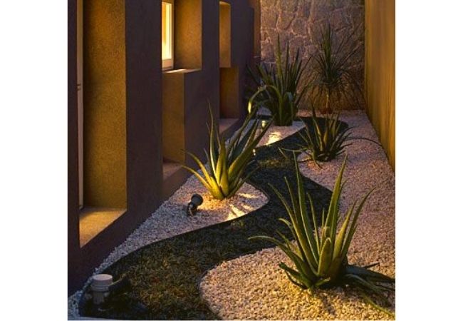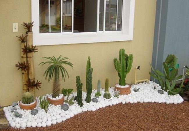 Um jardim pequeno com cactos e outras suculentas