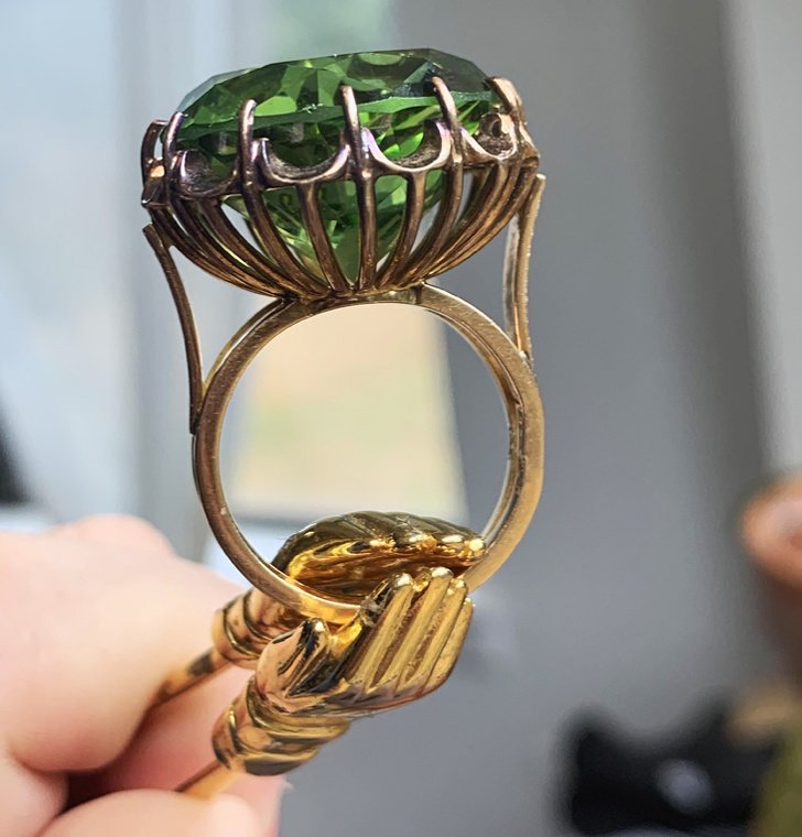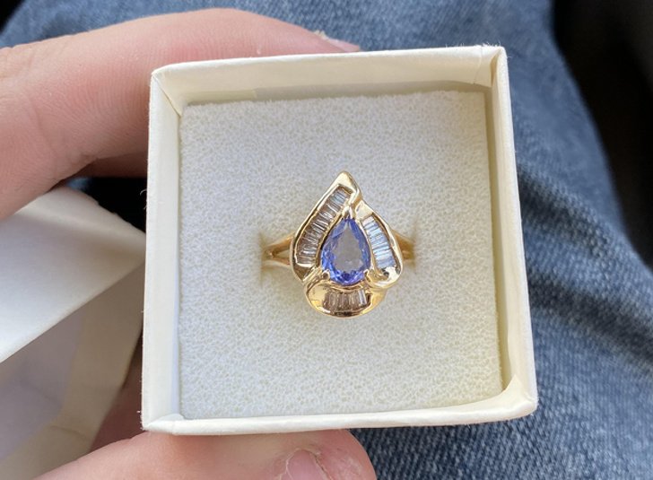 “Encontrei esta beleza em uma caixinha de bijuterias. E um anel de ouro 14 quilates com uma tanzanita cercada por 23 diamantes verdadeiros”