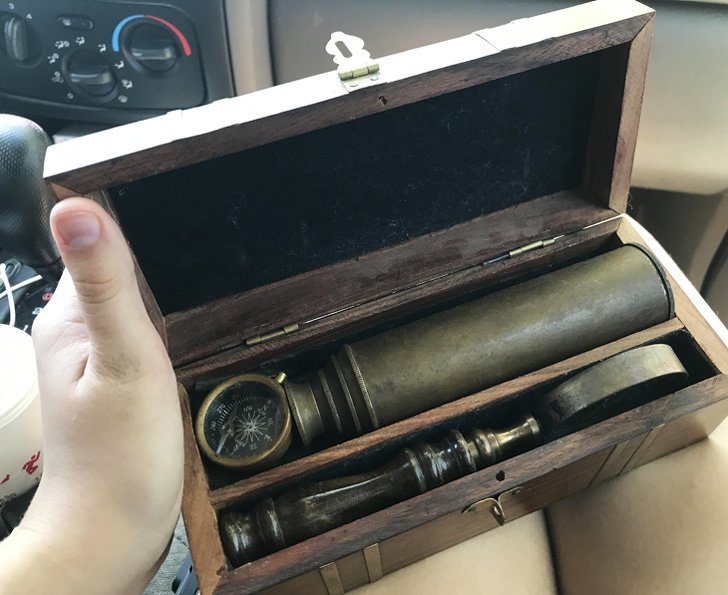 “Encontrei um estojo antigo com uma bússola, uma luneta e uma lupa dentro”